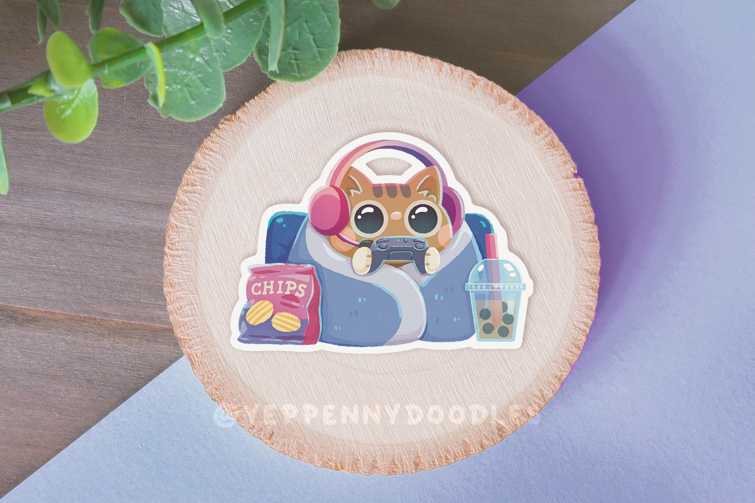 Comfy Gaming Cat - Single Die Cut Sticker by © Yeppenny Doodles.