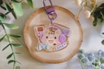 2" (or 5cm) wide acrylic keychain with a shiny purple clasp.